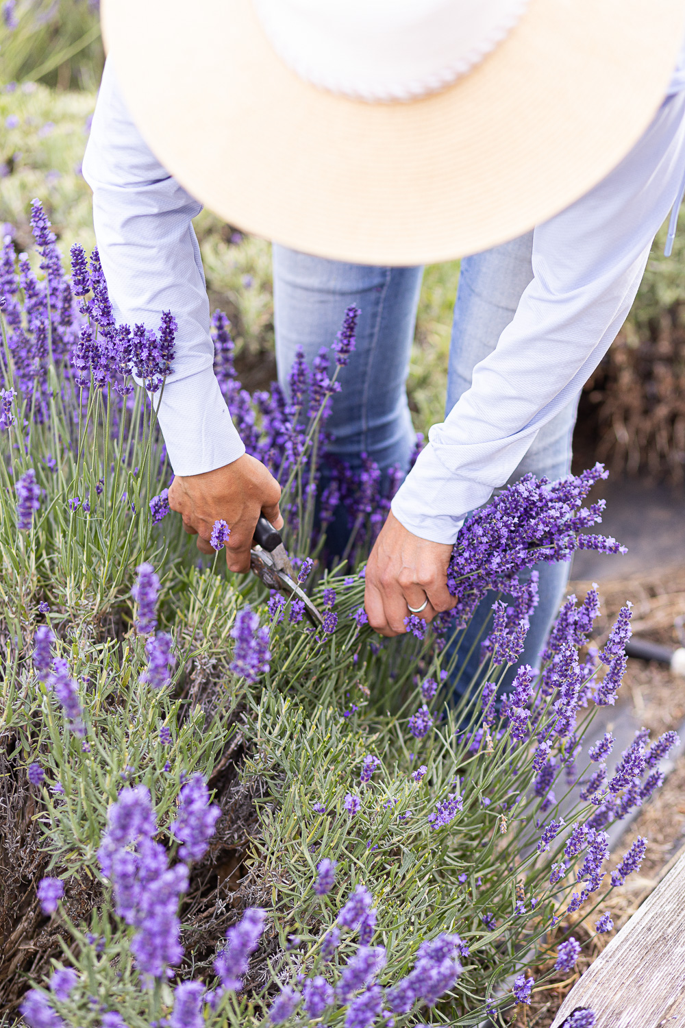 Through the summer, the lavender field turns from blue to green as we harvest from the edges of the field moving inwards. Some plants will show a second growth but most of the plants have just one bloom per season. We go through the whole field once more in the fall to prune the plants before the winter. This is labour intensive but an important step to keep the plants healthy and allow for a clean growth the following year.