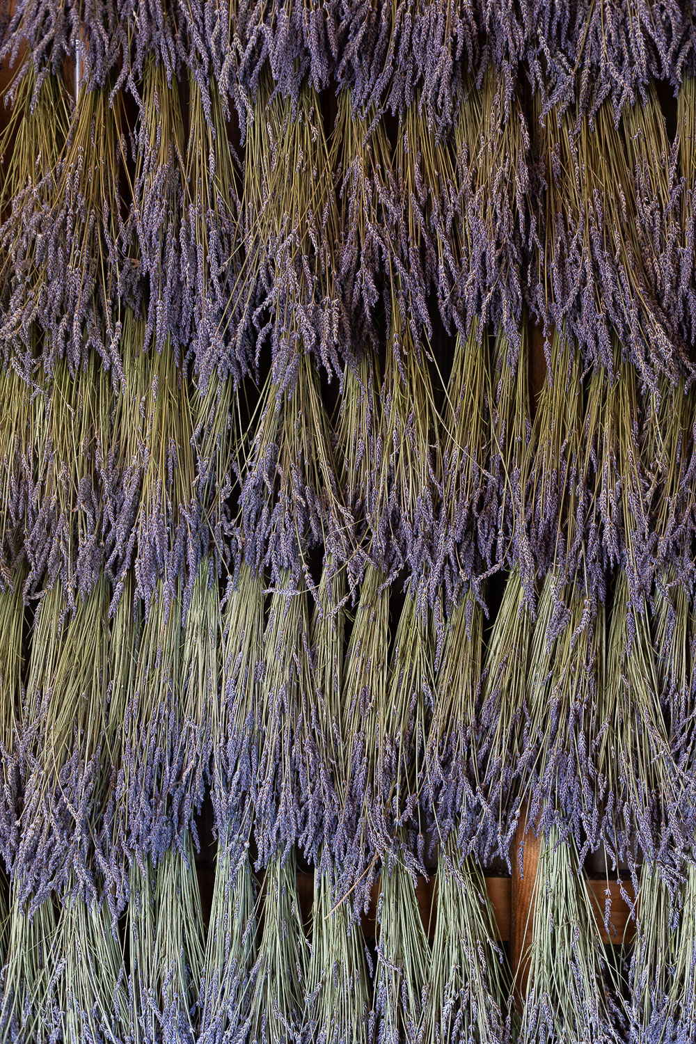 Our lavender season starts in June, when the English lavenders flower. The fresh stems are cut and bundled by hand and hung on the walls of our drying barn. The barn walls are usually covered with drying English lavender from late June to early July. After this, the hybrid lavender, Grosso, blooms and you can enjoy a sea of blue stretching from our patio to the forests surrounding the fields. By mid July, the lavender in the barn will be gradually switched over as we harvest the main lavender field. Once the lavender is dry it’s taken down from the wall and then further processed to remove the flower buds, or to create dried flower arrangements.